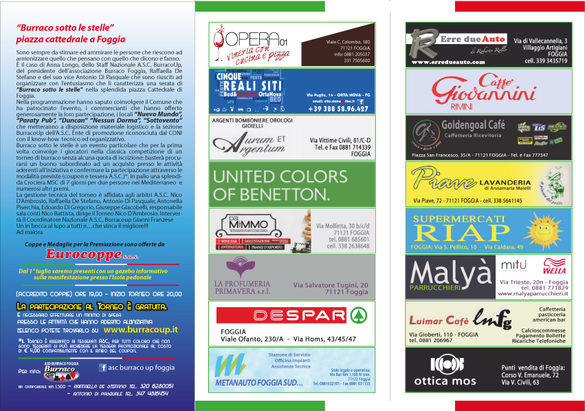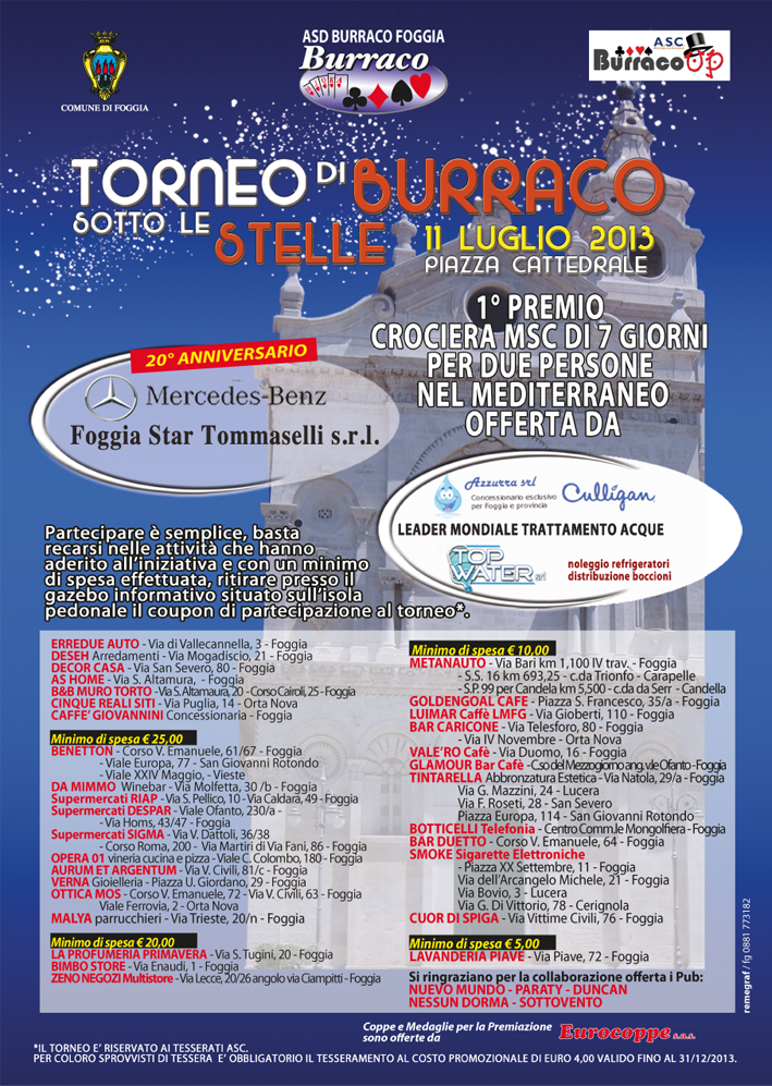 Si invitano tutti gli appassionati di burraco di Foggia e provincia a partecipare a questo straordinario evento. L'iscrizione al torneo è gratuita, basta solo effettuare un minimo di spesa c/o i negozi convenzionati che permetteranno lo svolgimento di questa unica manifestazione nella splendida piazza "Cattedrale di Foggia"...