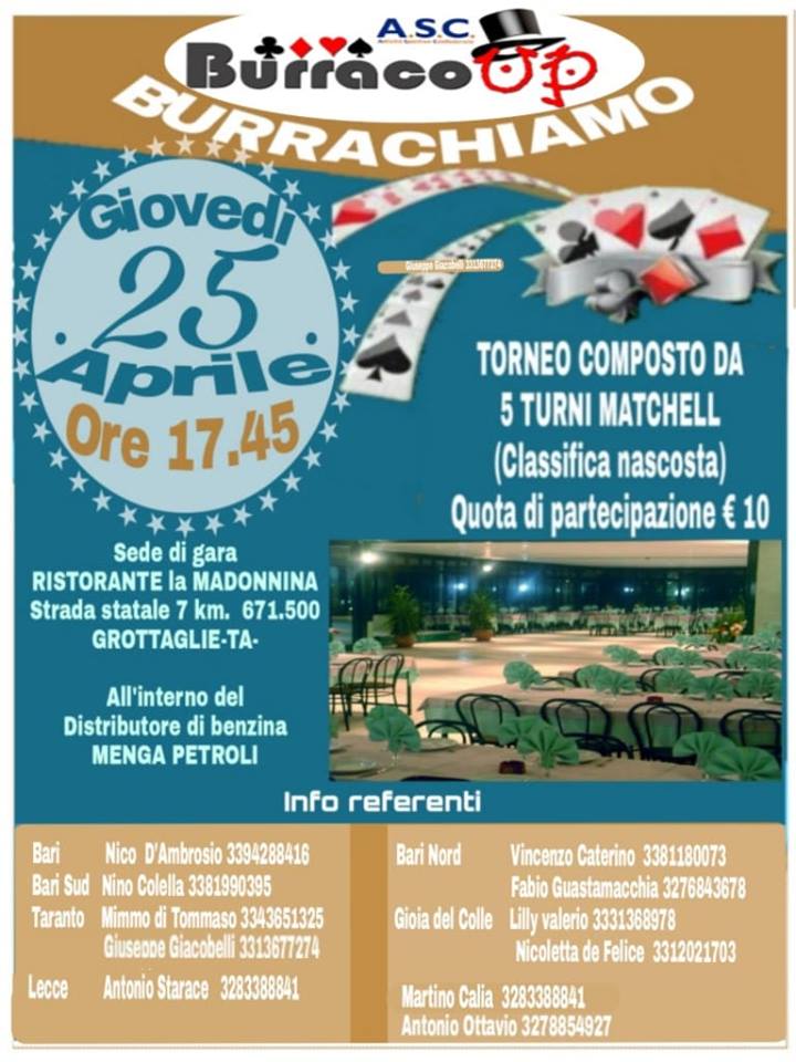 Le associazioni pugliesi organizzanoBURRACHIAMO25 APRILEristorante la Madonnina, statale7 km 671,500 GROTTAGLIE (TA)